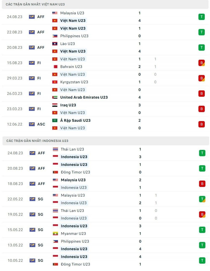 Thành tích đối đầu giữa U23 Việt Nam và U23 Indonesia