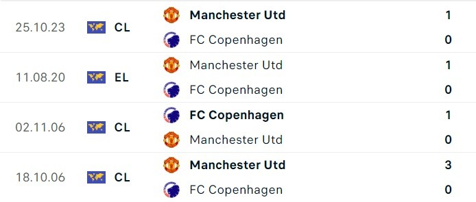 - 3 trận đối đầu vừa qua giữa Copenhagen và Man United có không quá 1 bàn/trận.