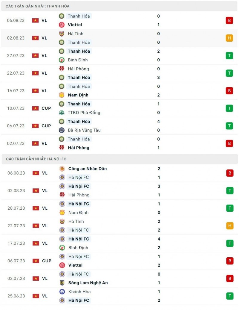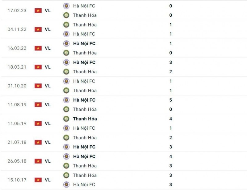 Thành tích đối đầu giữa Thanh Hóa và Hà Nội