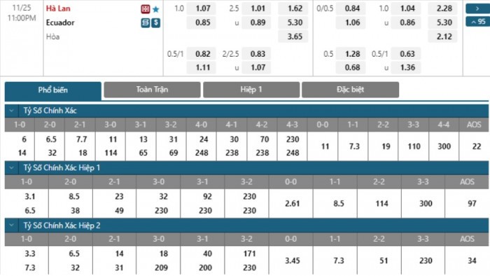| Tỷ lệ đặt cược giữa Hà Lan - Ecuador |