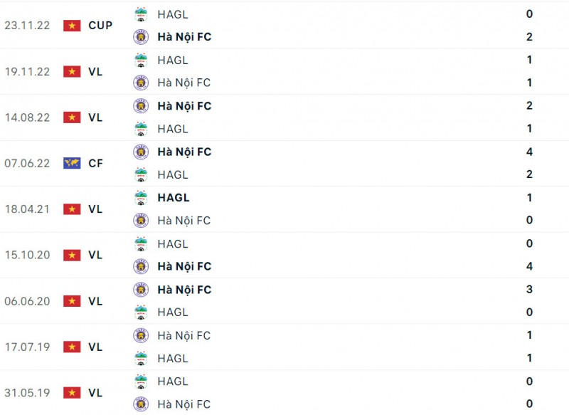 Suốt quãng thời gian tính từ năm 2018 tới nay, hai bên đã gặp nhau tổng cộng 11 lần. Tuy nhiên, HAGL mới chỉ mới thắng được một trận trước dàn sao CLB Hà Nội, trong trận đấu diễn ra trên sân nhà Pleiku ở mùa bóng 2021.