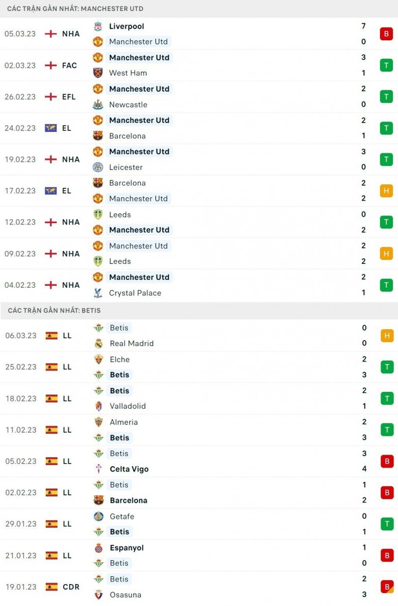 Thành tích đối đầu giữa Man United và Real Betis: