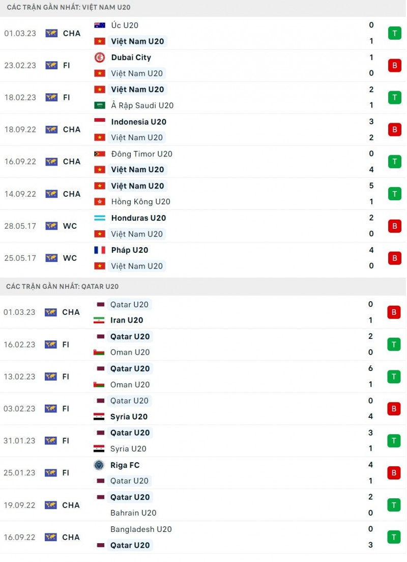 Thành tích đối đầu giữa U20 Việt Nam và U20 Qatar
