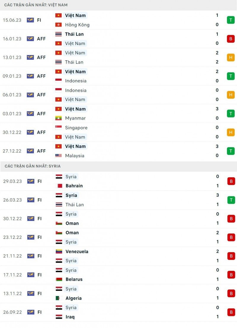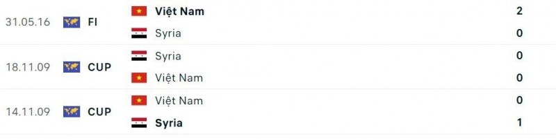 Trong quá khứ, đội tuyển Việt Nam và Syria từng chạm mặt nhau 3 lần. Cả hai cùng thắng một trận và có một trận đấu kết thúc với tỷ số hòa. Tuy nhiên trong lần chạm mặt gần đây nhất vào năm 2016 tại Việt Nam, chúng ta đã giành chiến thắng trước đối thủ.
