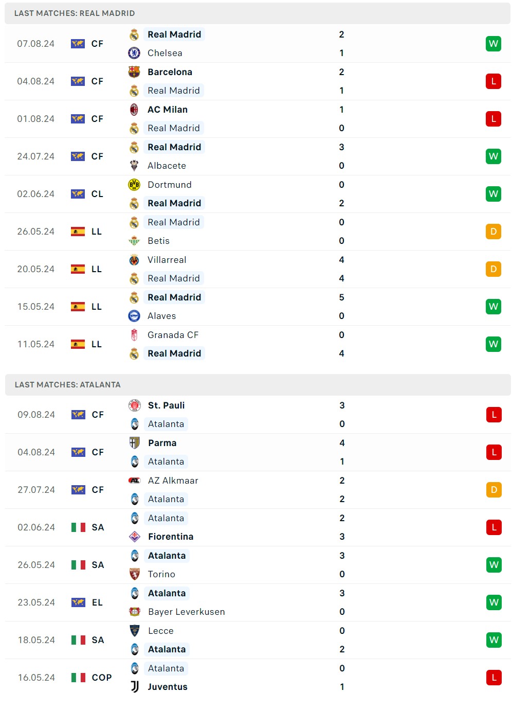 Trong lịch sử trận siêu cúp châu Âu, Real Madrid và Barcelona là đội bóng giàu thành tích nhất. Cả hai cùng có 5 lần giành siêu cúp châu Âu. Trong khi đó, với Atalanta, họ mới có lần đầu tiên tham dự siêu cúp châu Âu.