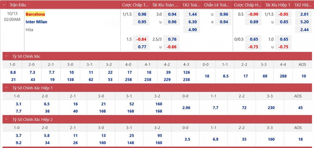 | Tỷ lệ soi kèo giữa Barcelona – Inter Milan |