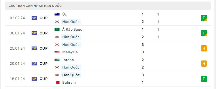 | Các trận gần nhất của Hàn Quốc. |