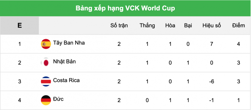 | Bảng xếp hạng bảng E World Cup 2022 ở hiện tại |