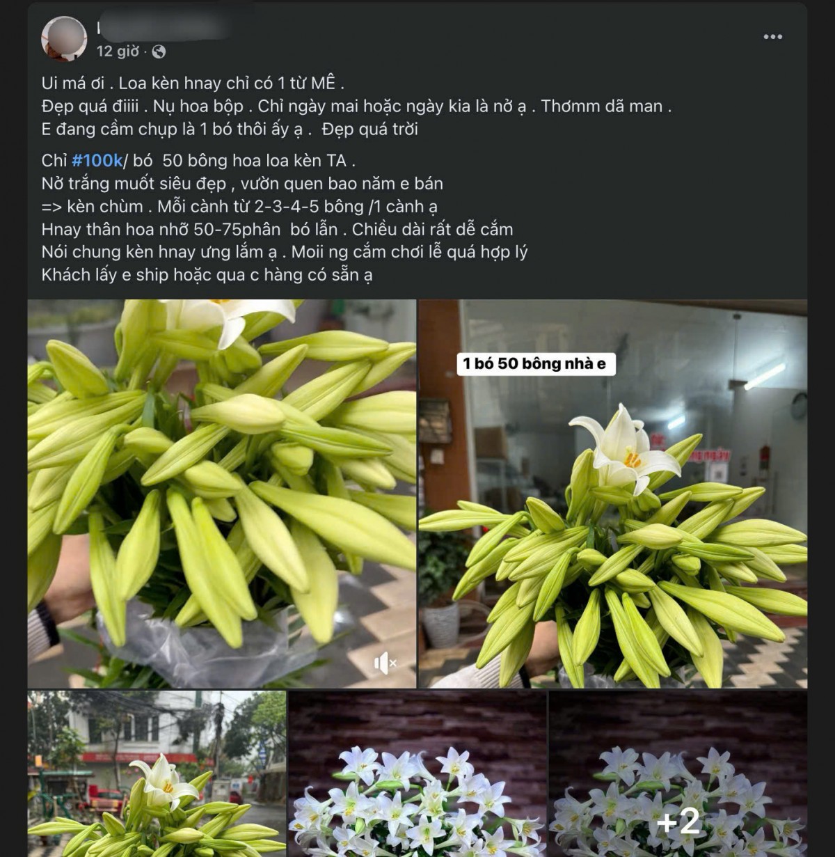 Đáng chú ý, trên thị trường online, giá loa kèn được rao bán với giá rẻ bất ngờ. Khảo sát trên các nhóm chợ mạng xã hội, giá loa kèn dao động chỉ từ 2.000 - 4.000 đồng/bông. Người bán sẽ bán theo bó từ 20 - 50 bông.