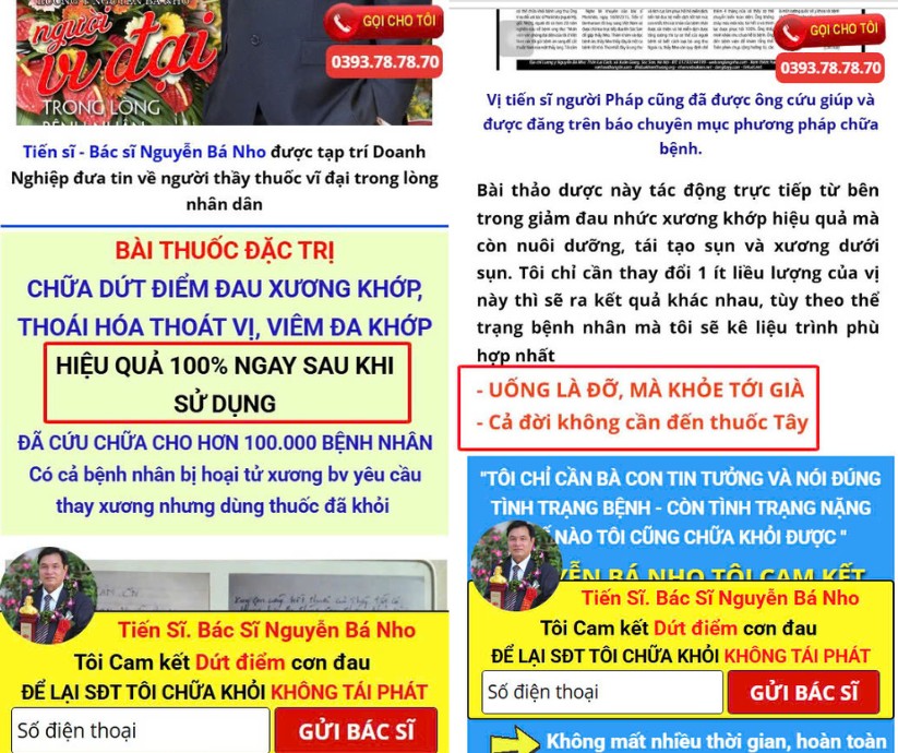 Tại một trang web khác có tên miền https://www.dutdiemxuongkhop.click/nguyen_ba_nho, cũng liên quan tới hình ảnh ông lang Nguyễn Bá Nho, người tiêu dùng dễ dàng bắt gặp loạt quảng cáo gây sốc như "hiệu quả chỉ sau 7 ngày sử dụng", "cam kết hoàn tiền nếu tái bệnh", "chữa khỏi cho hơn 100.000 người bệnh", "khỏe đến già", "hiệu quả 100%", "an toàn, không tác dụng phụ"... Thậm chí, trang web còn tuyên bố chữa khỏi cả bệnh nhân hoại tử xương.