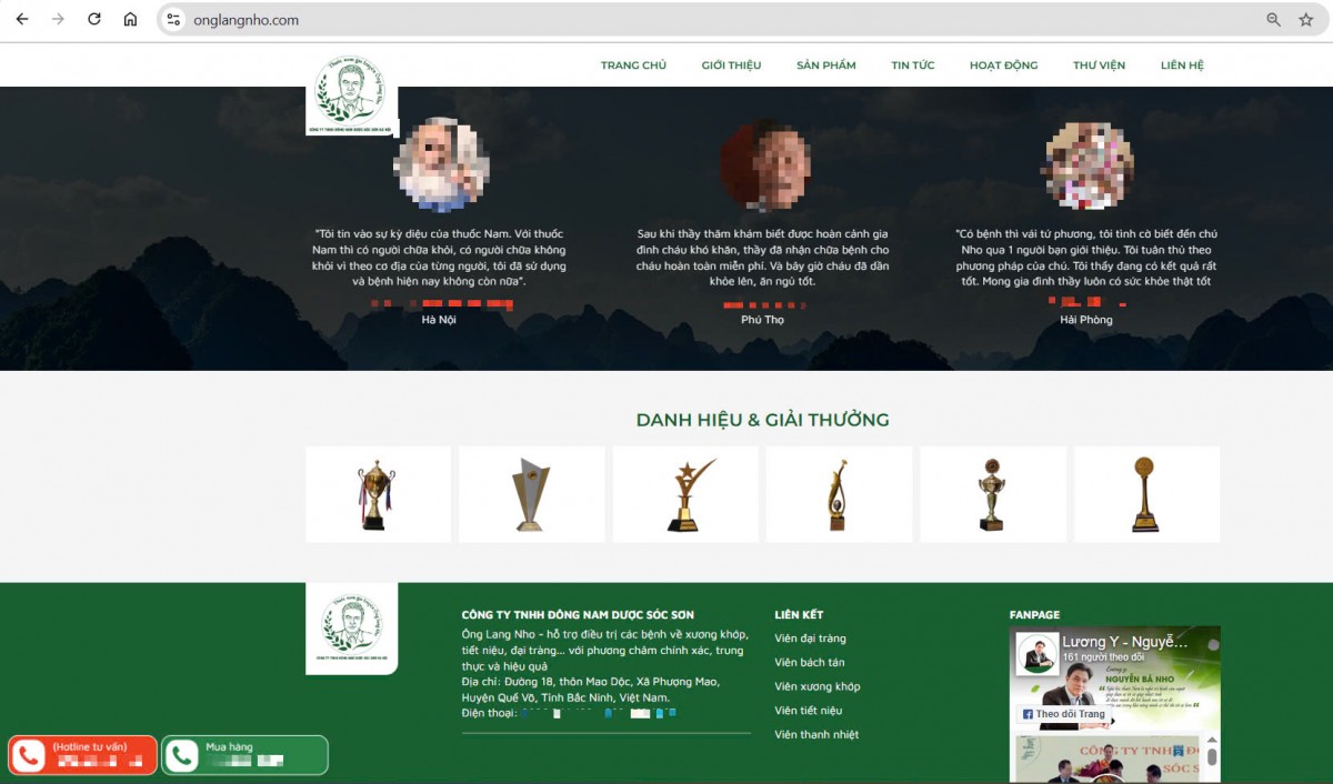 Cụ thể, tại website onglangnho.com, dưới chân trang giới thiệu thuộc sở hữu của Công ty TNHH Nam Dược Sóc Sơn. Dù tên công ty gắn liền với địa danh Sóc Sơn – một huyện nằm ở phía Bắc Hà Nội, nhưng địa chỉ công ty theo đăng ký lại nằm tại đường 18, thôn Mao Dộc, xã Phượng Mao, huyện Quế Võ, tỉnh Bắc Ninh.