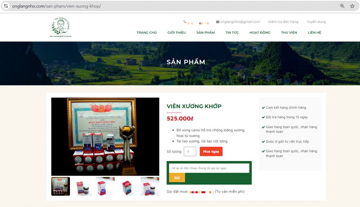 Trên trang website onglangnho.com hiện đang giới thiệu 5 sản phẩm, gồm: Viên bách tán, viên tiết niệu, viên đại tràng, viên thanh nhiệt và viên xương khớp. Các sản phẩm có giá dao động từ 485.000 đồng đến 1.500.000 đồng.