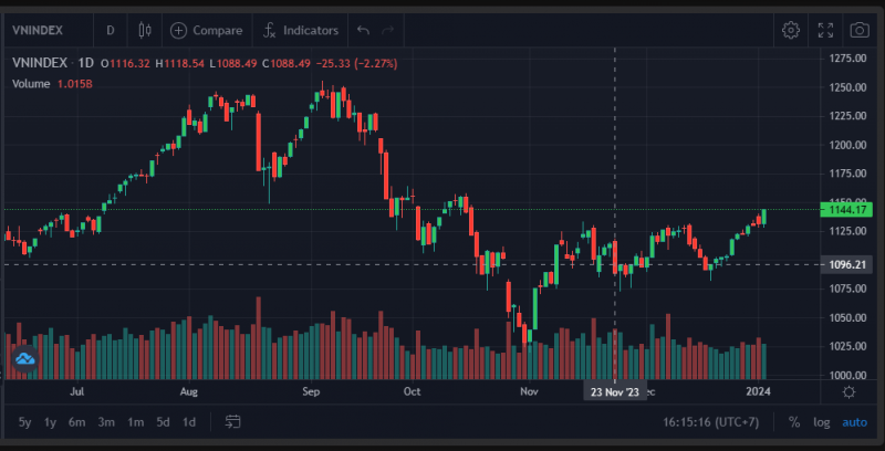 Đóng cửa phiên hôm nay ngày 3/1, VN-Index tăng gần 12,45 điểm (tương đương 1,1%) lên 1.144,17 điểm. Toàn sàn HoSE có 395 mã tăng (trong đó 14 mã trần), 71 mã đứng giá và 106 mã giảm. Ấn tượng nhất là nhóm cổ phiếu ngân hàng khi đóng góp 8,5 điểm tăng cho chỉ số phiên hôm nay.