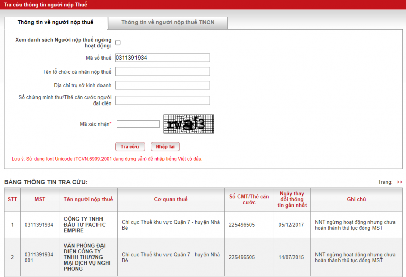 | Pacific Empire Investment đã ngừng hoạt động từ ngày 5/12/2017 nhưng chưa hoàn thành thủ tục đóng mã số thuế |