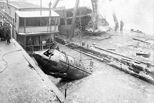 Vào mùa thu năm 1915, William Deno đang đặt sợi dây cáp ngầm dọc theo đáy sông Chicago, thì anh ta bất ngờ gặp một chiếc tàu ngầm kỳ lạ bị chìm trong bùn. Ba tháng sau, con tàu bị kéo lên bờ, người ta tìm thấy bên trong có xương của một người đàn ông và một con chó. Câu chuyện đã ngay lập tức được đăng tải lên các tờ báo thời đó. Hiện tại vẫn chưa biết ai đã chế tạo chiếc tàu ngầm này và chết trong đó.