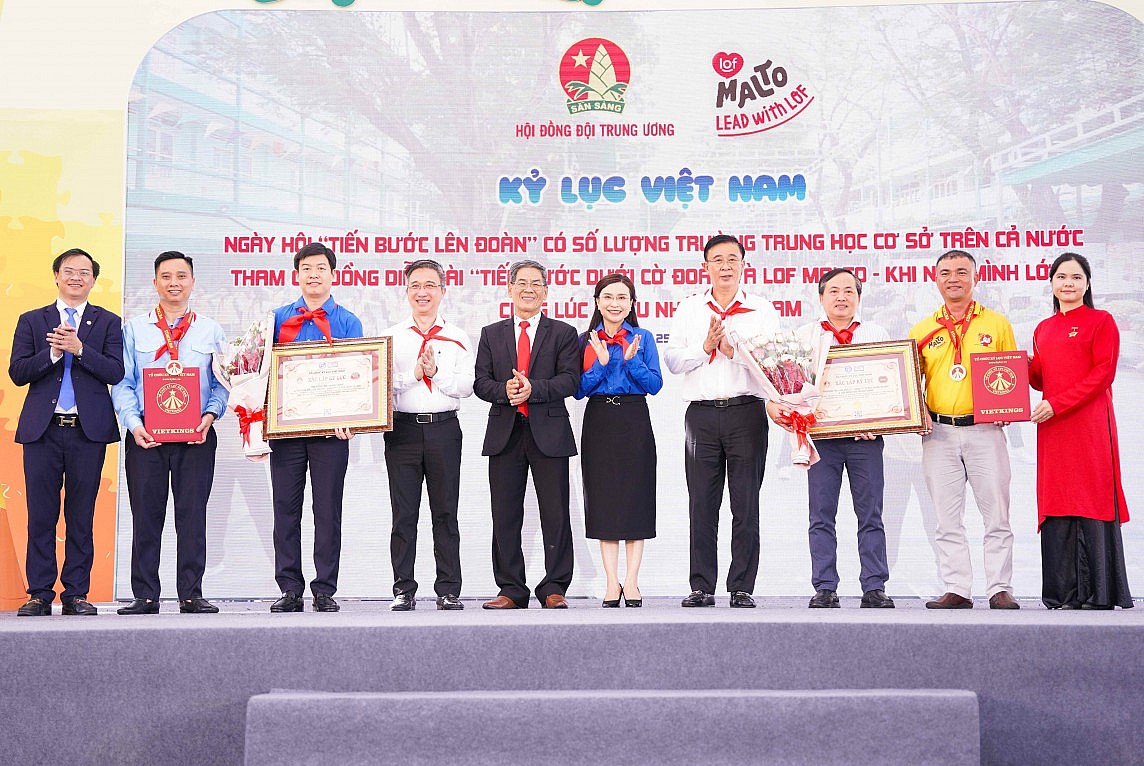 Màn đồng diễn được tổ chức Kỷ lục Việt Nam (VietKings) xác lập kỷ lục đồng diễn sân trường Việt Nam với số lượng học sinh THCS tham gia lớn nhất. Đây là một trong những hoạt động của Ngày hội “Tiến bước lên Đoàn” dành cho khối các trường THCS trên toàn quốc nhân kỷ niệm 93 năm ngày thành lập Đoàn TNCS Hồ Chí Minh do Hội đồng đội Trung ương và thương hiệu Lof Malto - Công ty Cổ phần Quốc tế IDP phối hợp tổ chức.
