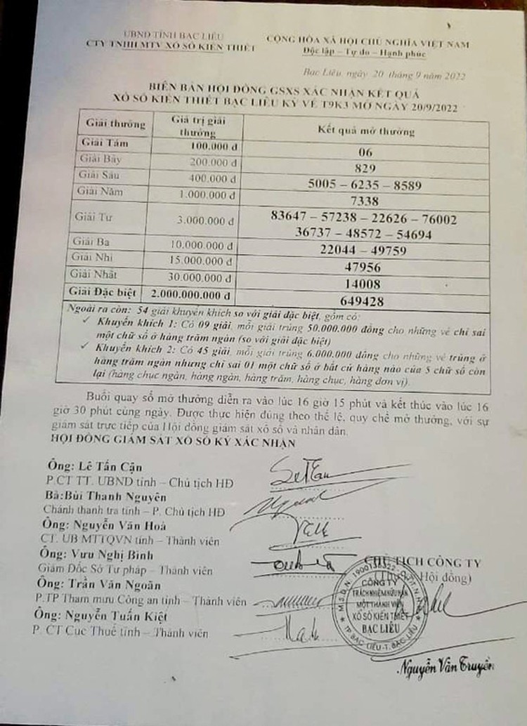 Từ kết quả này, các đại lý vé số cho in vé dò phát cho người bán vé số dạo và cũng là căn cứ để các đại lý đổi thưởng cho người chơi vé số. Tuy nhiên sau đó chủ đại lý vé số này phát hiện biên bản hội đồng giám sát xổ số xác nhận kết quả xổ số Bạc Liêu kỳ vé K9-T3 ngày 20/9, kết quả giải nhất lại là 14008. Kết quả này có xác nhận của các thành viên hội đồng giám sát xổ số, trong đó có chủ tịch hội đồng là ông Lê Tấn Cận (Phó chủ tịch thường trực UBND tỉnh Bạc Liêu).