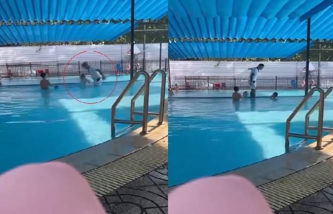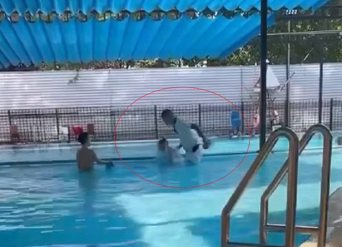 | Hình ảnh N.T.Đ. (khoanh tròn) dìm bé trai xuống bể bơi ở phố Đặng Thai Mai, phường Quảng An, quận Tây Hồ, TP. Hà Nội. Ảnh chụp lại từ clip |