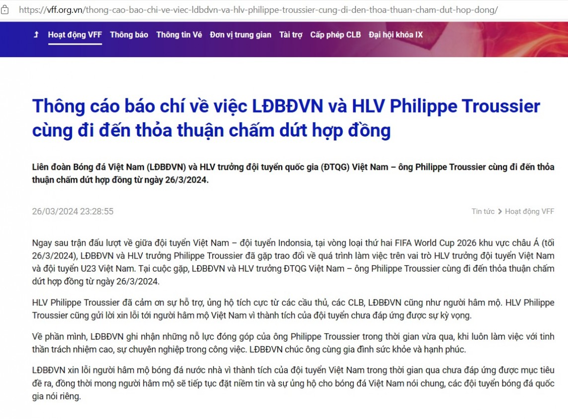 | Dòng xin lỗi của VFF được "đính kèm" trong thông cáo báo chí về việc chia tay huấn luyện viên Troussier |