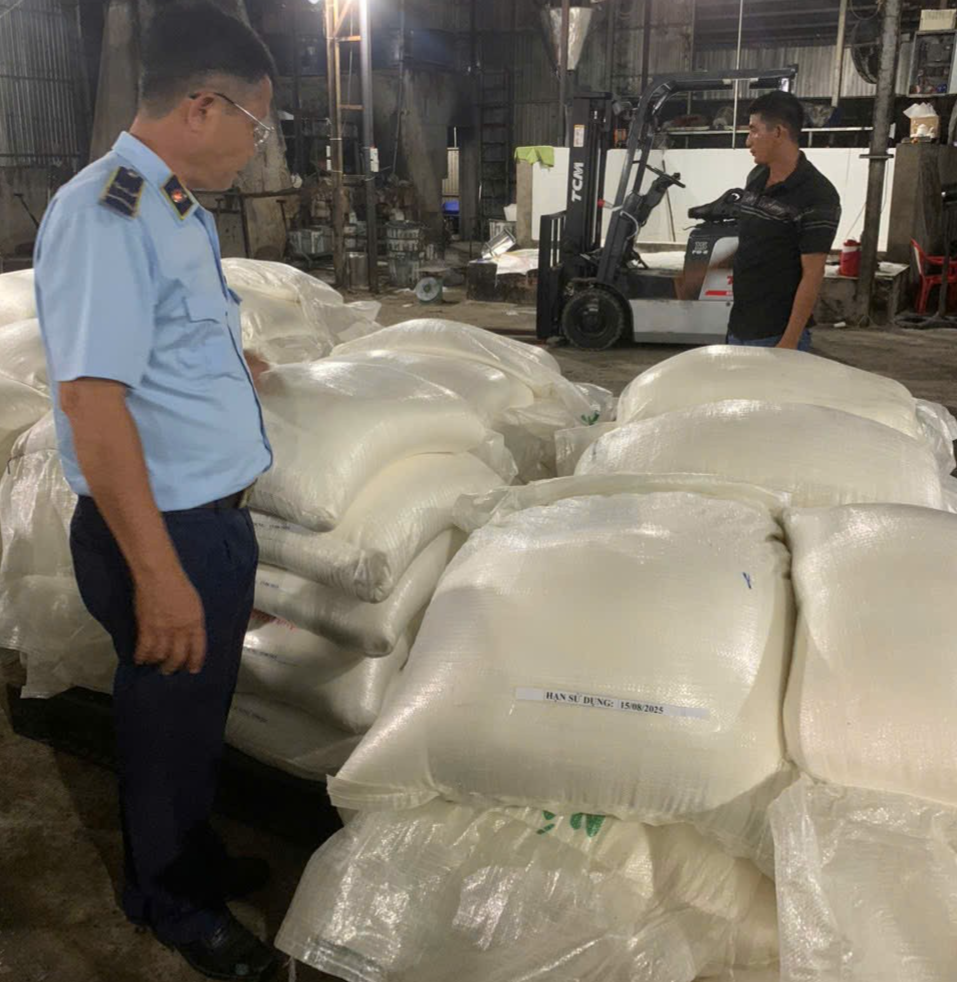 Đoàn kiểm tra phát hiện hộ kinh doanh Hoàng Phát đang chứa 98 bao đường cát (đường đã được đóng gói sẵn theo khối lượng 50kg/bao), trên bao bì không thể hiện tên, nhãn hiệu, nơi sản xuất, có hạn sử dụng đến ngày 15/8/2025. Tổng khối lượng trên bao bì khoảng 4,9 tấn.