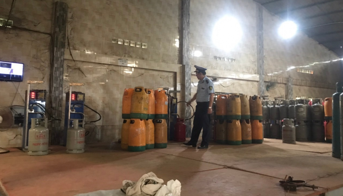 | Đội Quản lý thị trường số 1 phối hợp với Công an xã Hựu Thạnh, huyện Đức Hòa kiểm tra, phát hiện điểm chiết nạp gas có dấu hiệu giả mạo nhãn hiệu (Ảnh: Cục QLTT tỉnh Long An). |