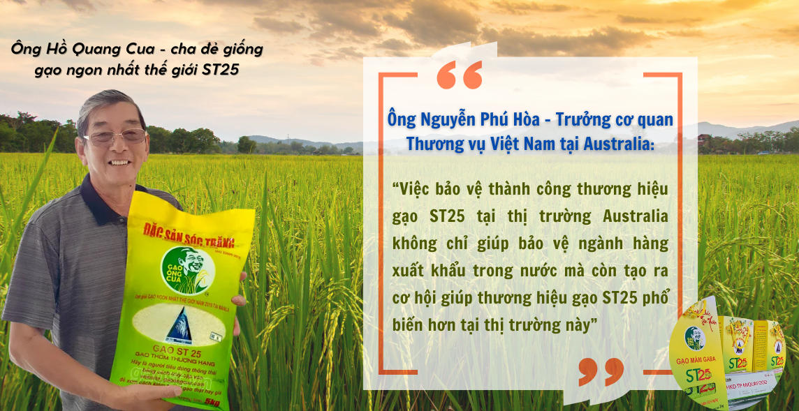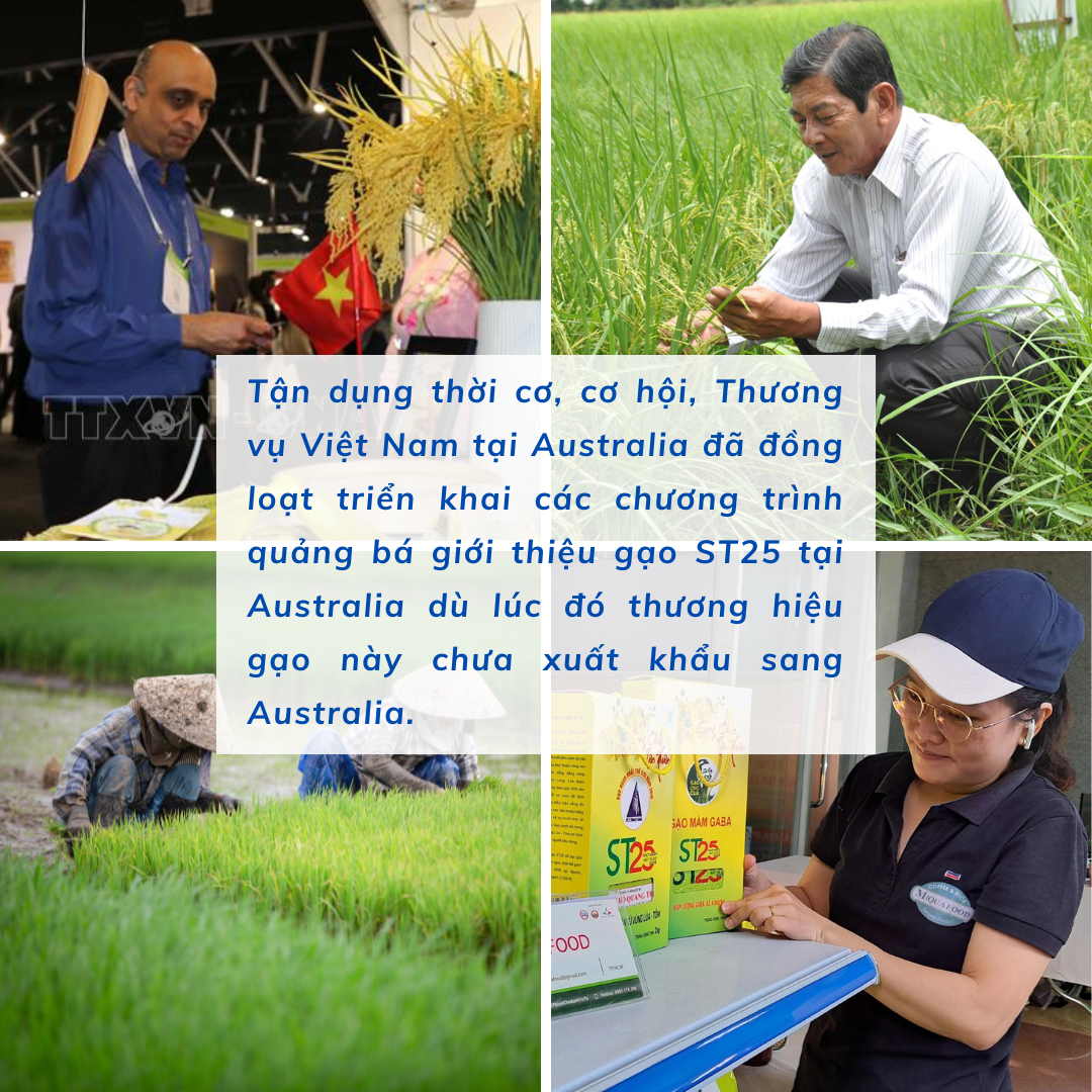 Năm 2019 tại thị trường Australia, người tiêu dùng nước này chỉ biết đến các sản phẩm gạo Thái Lan. Thậm chí, trong chuyến khảo sát của Thương vụ vào năm 2019, các cán bộ Thương vụ cảm thấy chạnh lòng, trong khi Việt Nam là một cường quốc về xuất khẩu gạo thì tại Australia, khi tổ chức các chương trình thiện nguyện cho kiều bào Việt, người Việt Nam phải bỏ tiền của người Việt để mua gạo Thái Lan tặng lại người Việt. Khắc phục tình trạng này, năm 2019 tại Philippines, thương hiệu gạo ST25 của Việt Nam đã đạt giải Nhất gạo ngon nhất thế giới. Tận dụng thời cơ, cơ hội, Thương vụ Việt Nam tại Australia đã đồng loạt triển khai các chương trình quảng bá giới thiệu gạo ST25 tại Australia dù lúc đó thương hiệu gạo này chưa xuất khẩu sang Australia. |