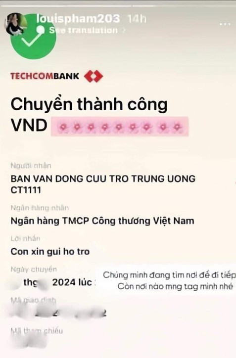| Louis Phạm chia sẻ biên lai chuyển khoản ủng hộ Ủy ban MTTQ Việt Nam trên trang cá nhân (Ảnh màn hinh). |
