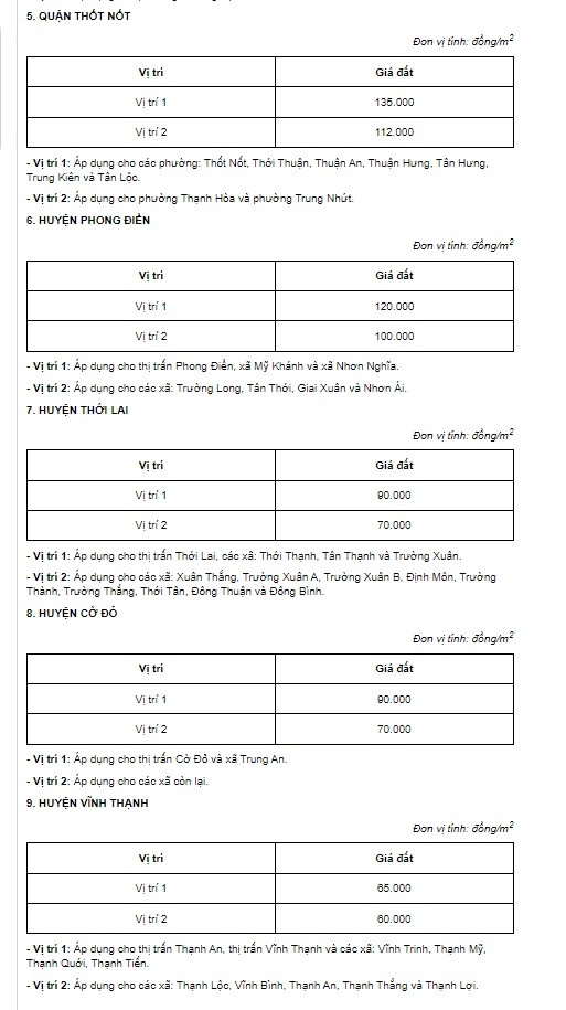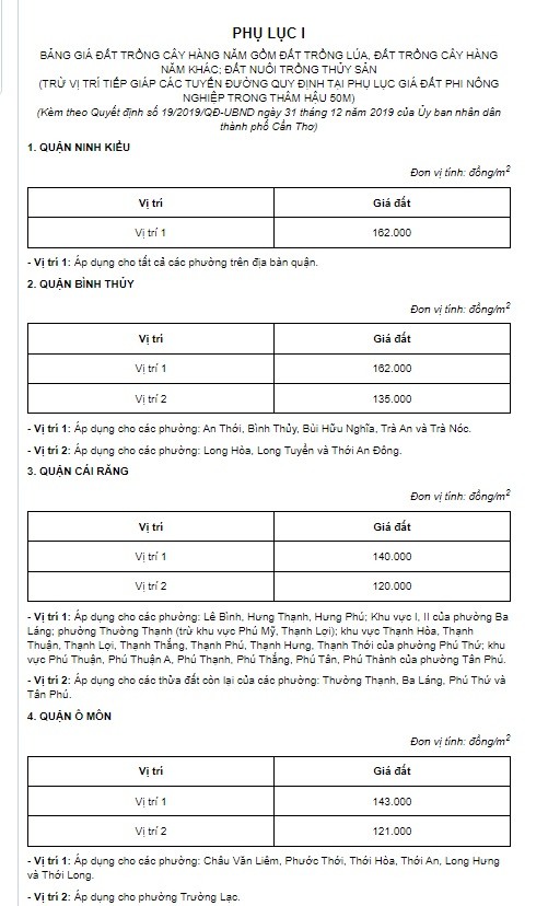 Theo đó, giá đất trồng cây hàng năm gồm đất trồng lúa, đất trồng cây hàng năm khác, đất nuôi trồng thủy sản cao nhất là 162 nghìn đồng/m2, theo vị trí 1 thuộc tất cả các phường trên địa bàn quận Ninh Kiều và thấp nhất là 60 nghìn đồng/m2, theo vị trí 2 thuộc huyện Vĩnh Thạnh. Giá đất trồng cây hàng năm cao nhất vẫn là quận Ninh Kiều với giá 250 nghìn/m2, vị trí 1 và thấp nhất là 90 nghìn/m2, vị trí 1 thuộc huyện Vĩnh Thạnh…