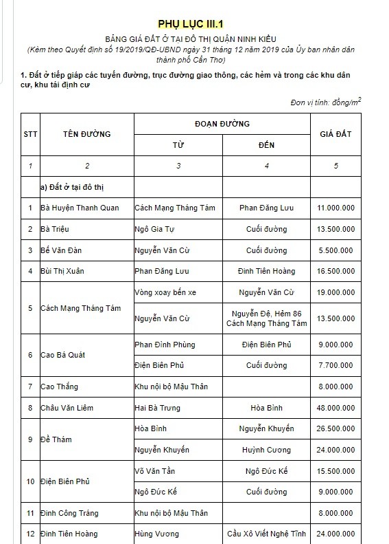 | Giá đất ở đô thị cao nhất thuộc quận Ninh Kiều |