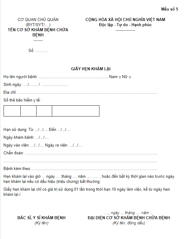 | Mẫu giấy hẹn khám lại có thời gian trong 10 ngày làm việc |