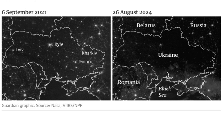 | Xung đột đã làm thay đổi hình ảnh vệ tinh ban đêm của Ukraine. Ảnh: Guardian |