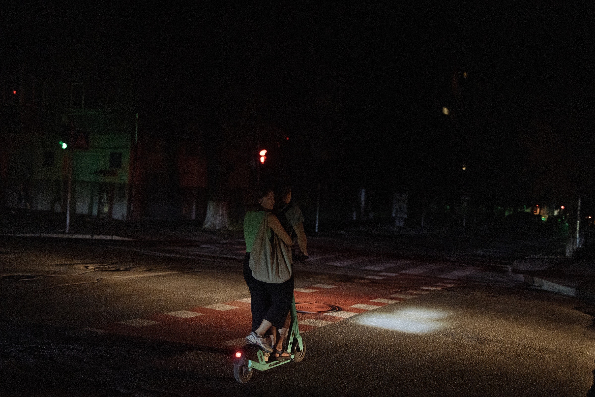 | Người Kiev di chuyển trên con đường bị tắt đèn, khi khu phố Podil mất điện sau đòn không kích của Nga hôm 28/8. Ảnh: AP |