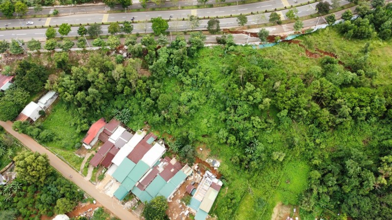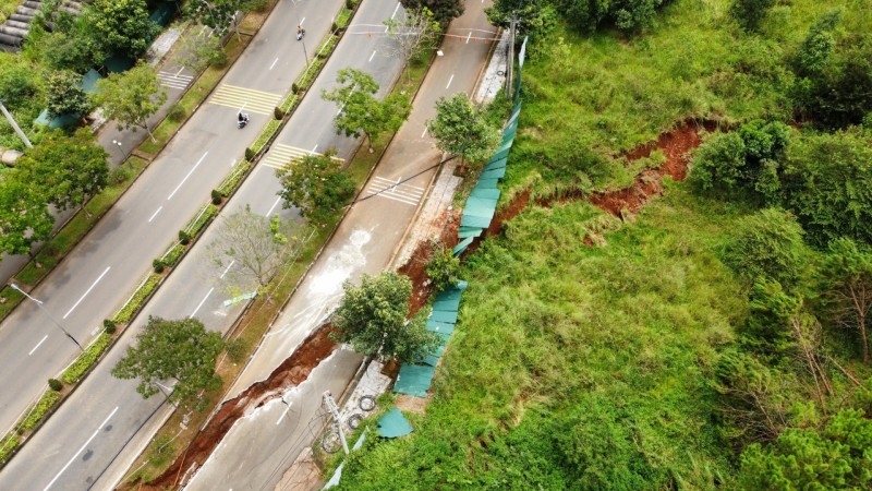 | Vết sạt trượt tại Quốc lộ 14 đoạn qua TP. Gia Nghĩa, tỉnh Đắk Nông nhìn từ trên cao |