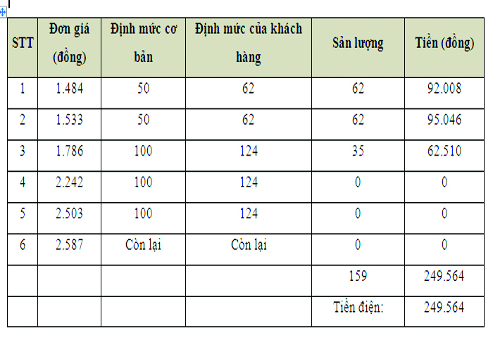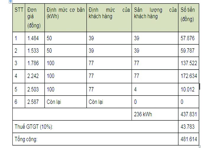 Cụ thể, phần sản lượng điện tính theo giá 1.484 đ/kWh (bậc 1) bằng 50 kWh định mức chia cho 31 ngày của tháng x  24 ngày sử dụng điện thực tế x 1(số hộ sử dụng) = 39 kWh; phần sản lượng điện tính theo giá 1.533 đ/kWh sẽ bằng (50 kWh : 31) x  24 ngày x 1 = 39 kWh. Tương tự sản lượng điện năng tính theo giá 1.786 đ/kWh (Bậc 3) bằng (100 kWh : 31) x  24 ngày x 1= 77 kWh; sản lượng điện năng tính theo giá 2.242 đ/kWh (Bậc 4) bằng (100 kWh : 31) x  24 ngày x 1= 77 kWh. Phần sản lượng điện năng tính theo giá 2.503 đ/kWh (bậc 5) sẽ bằng 236-39-39-77-77 = 4 kWh.