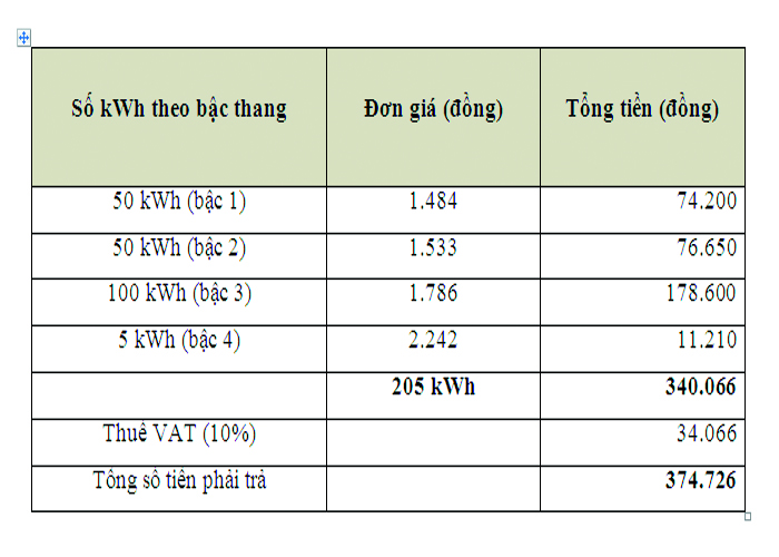 Ví dụ: Tổng số kWh điện năng của khách hàng sử dụng trong tháng 3 là 205 kWh (tính từ ngày 11/3 đến 10/4). Nghĩa là số ngày sử dụng điện thực tế là 31 ngày (tháng 3 có 31 ngày) do đó Hóa đơn tiền điện tháng 4 được tính như sau: