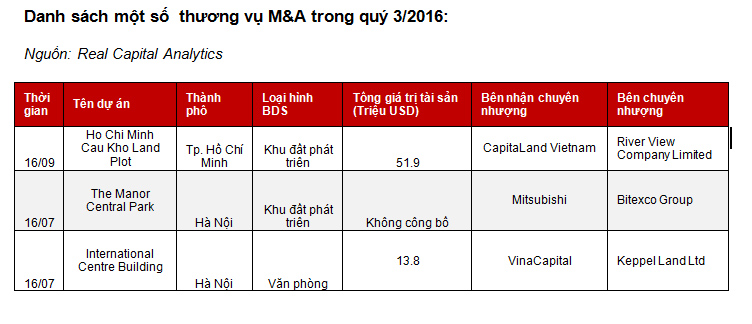 Theo nghiên cứu mới nhất vừa được Công ty Nghiên cứu Jones Lang Lasalle (JLL) Việt Nam công bố, hoạt động mua bán và sáp nhập (M&A) bất động sản Việt Nam trong quý III/2016 chỉ ghi nhận được ba giao dịch đáng chú ý.