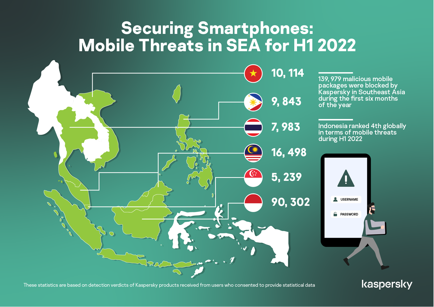 Số liệu thống kê mới nhất từ Kaspersky cho thấy, số lượng tấn công từ phần mềm độc hại di động trong khu vực Đông Nam Á trong nửa đầu năm 2022 là 122.526, thấp hơn cùng kỳ năm ngoái (382.575 - chưa bao gồm phần mềm quảng cáo (adware) và phần mềm gây hại (riskware)).