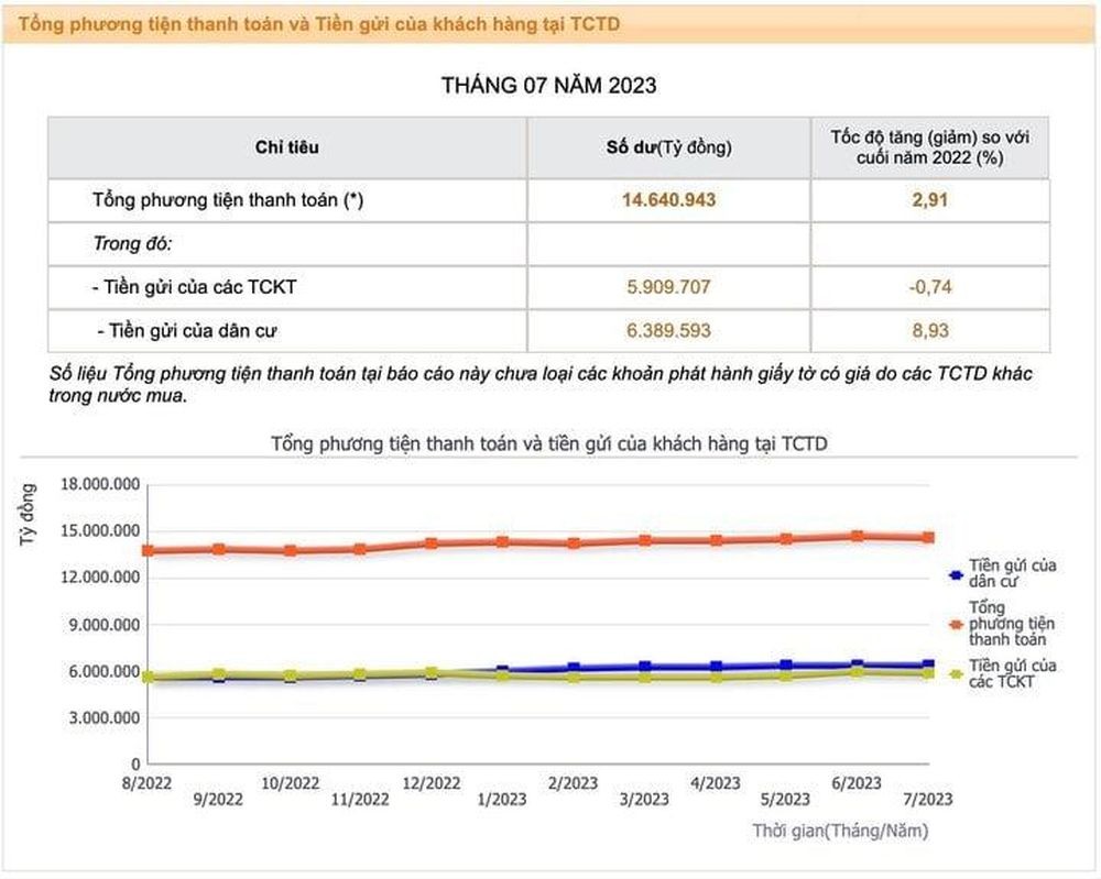 Thống kê mới nhất của Ngân hàng Nhà nước Việt Nam, tính đến hết tháng 7/2023, số dư tiền gửi của dân cư vào hệ thống ngân hàng đạt 6.389.593 tỷ đồng, tăng thêm 6.707 tỷ đồng so với tháng trước và tăng 8,93% so với cuối năm 2022.