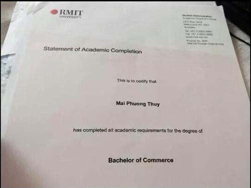 CôngThương - Mai Phương Thúy vừa đăng tải trên trang cá nhân hình ảnh tờ giấy chứng nhận tốt nghiệp ngành Thương mại của trường Đại học Quốc tế RMIT, kèm dòng chia sẻ khá dài, đề cập việc cô muốn chứng minh đã hoàn thành việc học, xóa bỏ mọi nghi vấn học mãi không ra trường.