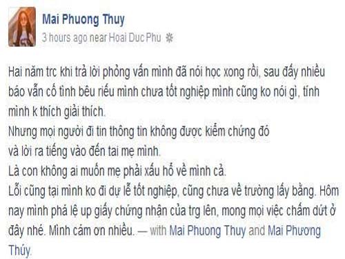 Thế nhưng, sau một thời gian dài Nam tiến và bận rộn với các hoạt động nghệ thuật, Mai Phương Thúy ít đề cập đến việc học của mình. Điều này đã khiến nhiều trang tin nghi ngại, hoa hậu đang giấu diếm thông tin chuyện học hành không ''nên đầu nên đũa''. Nhiều đồn đoán cho rằng cô bị cho thôi học và không được phát bằng tốt nghiệp. Việc công khai bằng tốt nghiệp mới đây phần nào đã chứng minh Mai Phương Thúy là một trong những hoa hậu tài sắc vẹn toàn.