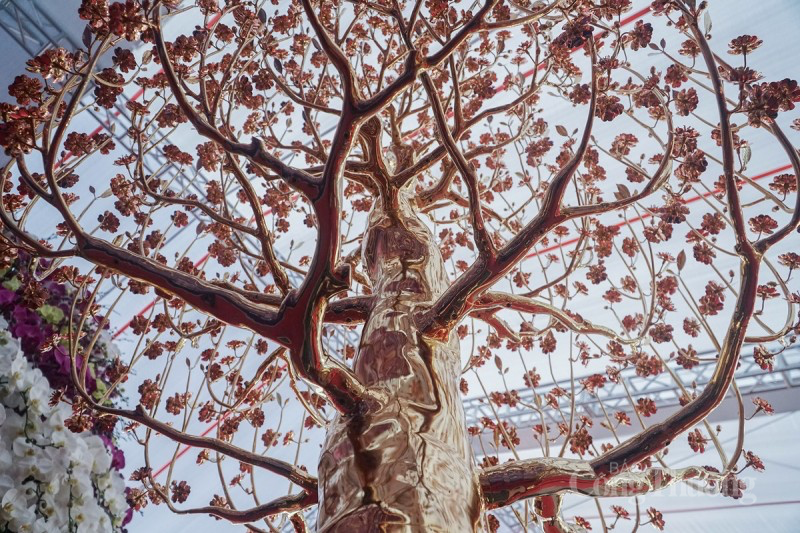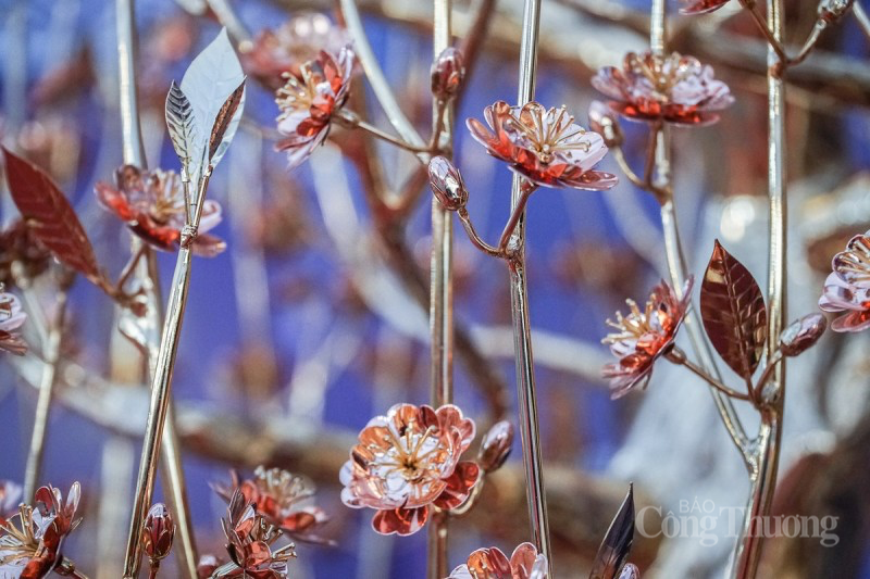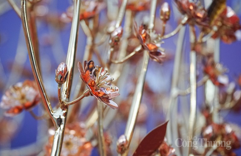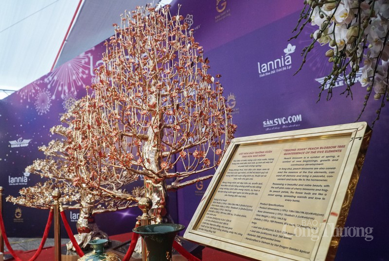 Toàn bộ cây hoa đào có 13 cành chính, 243 cành phụ, 789 hoa, 808 nụ, được làm bằng hợp kim đồng mạ vàng 24k. |