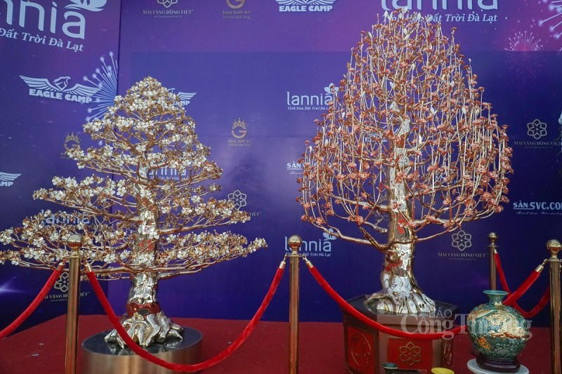 Ngoài cây đào mạ vàng, tại đây cũng trưng bày cây hoa mai mạ vàng 24k - biểu tượng của sự “sum vầy hạnh phúc – sung túc thịnh vượng". |
