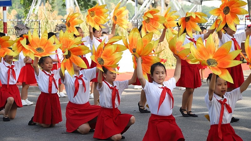 | Thiếu nhi trường Tiểu học Chu Văn An trình diễn tiết mục hát múa bên hồ Gươm |