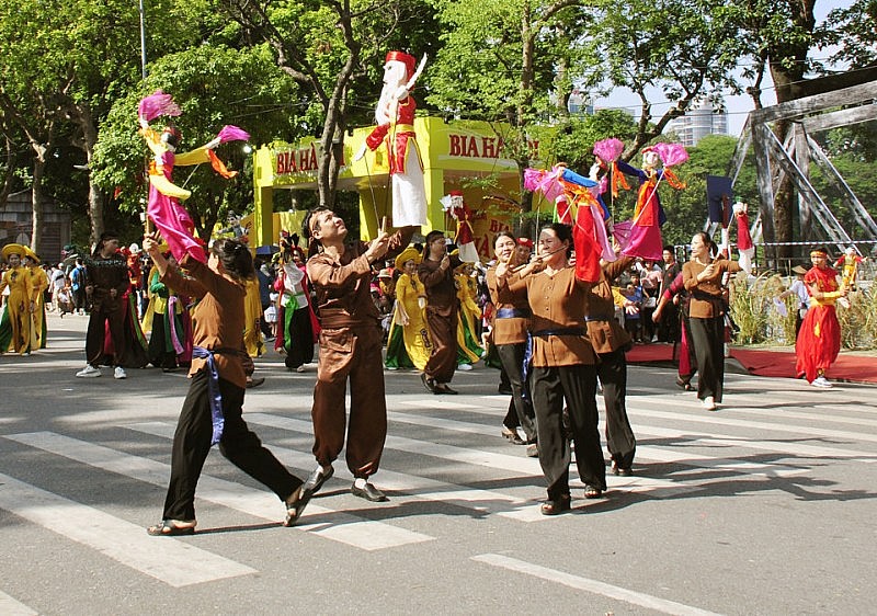 Người xem cũng vô cùng thích thú với các đoàn diễu hành giới thiệu nghệ thuật rối cạn của huyện Mỹ Đức, diều sáo của huyện Đông Anh, đoàn biểu diễn nghệ thuật đường phố, biểu diễn trang phục dân tộc, múa nghệ thuật “Vũ điệu trên mây.”