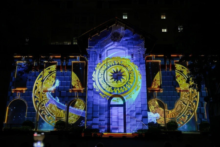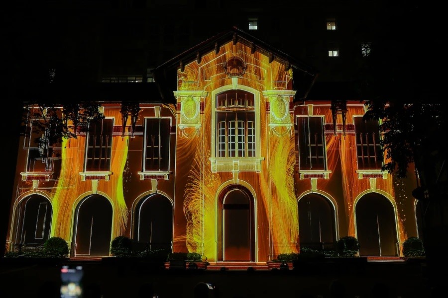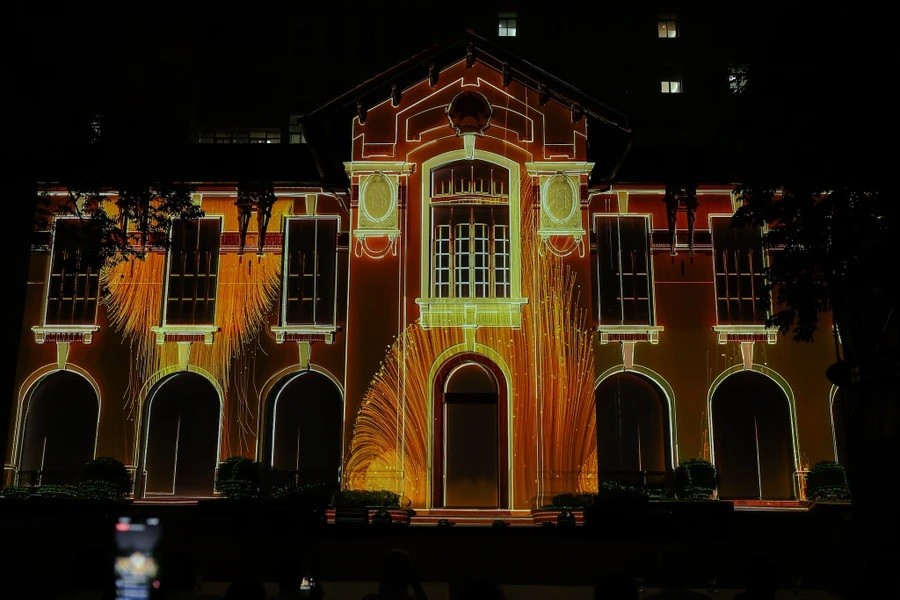| Trụ sở Bộ TT&TT rực rỡ trong đêm dưới màn trình chiếu 3D mapping. Ảnh: Bộ Thông tin và Truyền thông |