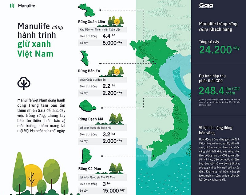Với sự phối hợp từ Trung tâm Bảo tồn Thiên nhiên Gaia, Manulife đặt mục tiêu phủ xanh hơn 4 khu rừng trải dài khắp 3 miền Bắc - Trung - Nam, với cam kết trồng tổng cộng 24.200 cây, tương đương 12,8 héc ta rừng trong năm 2023. Theo Gaia, mỗi hecta rừng trồng có thể hấp thụ khoảng 99-123,2 tấn CO2 mỗi năm.