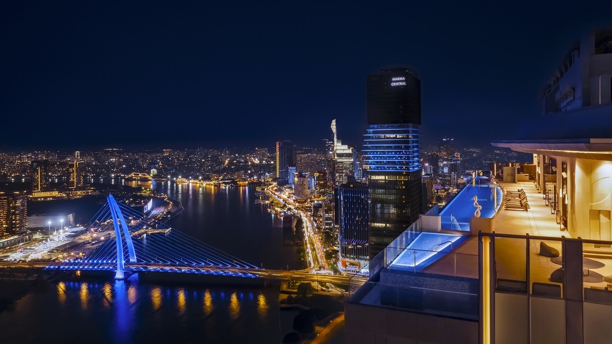 Hồ bơi rooftop sở hữu tầm nhìn ngoạn mục, ôm trọn khung cảnh phồn hoa của thành phố và dòng sông Sài Gòn lấp lánh.