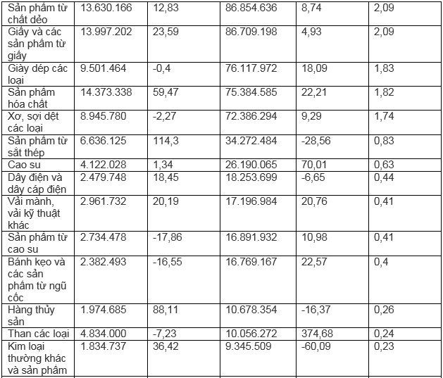 Bên cạnh đó, Việt Nam còn xuất khẩu chất dẻo nguyên liệu sang Indonesia với 257 triệu USD, tăng 34,17% so với cùng kỳ năm trước, chiếm 6,19% tỷ trọng; phương tiện vận tải, phụ tùng đạt 252 triệu USD, tăng 2,11% so với cùng năm trước, chiếm 6,07% tỷ trọng.