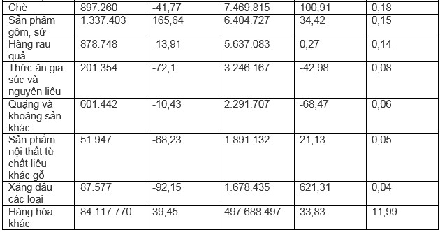 Ngoài ra, Việt Nam còn xuất khẩu thủy sản sang thị trường này với 10,6 triệu USD, giảm 16,37% so với cùng kỳ năm trước; hàng rau quả với 5,6 triệu USD, tăng 0,27% so với cùng kỳ năm trước; chè với 7,46 triệu USD, tăng mạnh tới 100,9% so với cùng kỳ, than các loại với 10,056 triệu USD, tăng 374,6% so với cùng kỳ, xăng dầu các loại với 1,67 triệu USD, tăng 621% so với cùng kỳ...