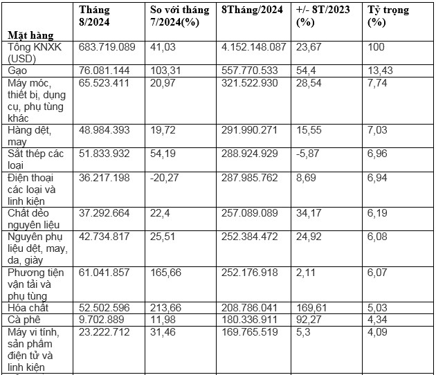 Trong 8 tháng năm 2024, mặt hàng gạo dẫn đầu kim ngạch xuất khẩu sang thị trường Indonesia đạt 557,7 triệu USD, tăng 54,4% so với cùng kỳ năm trước, chiếm 13,4% tỷ trọng xuất khẩu. Tiếp đến là mặt hàng máy móc, thiết bị, dụng cụ và phụ tùng đạt 321,5 triệu USD, tăng 28,5,%, chiếm 7,7% tỷ trọng xuất khẩu.